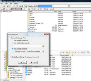 Trong giao diện chính của Magic ISO Maker, từ cây thư mục ở khung phía dưới bên trái, bạn tìm đến thư mục expandedSetup, đánh dấu chọn và kéo thả năm thư mục cùng ba file vừa xuất hiện trong khung phía dưới bên phải lên khung phía trên bên phải.Tiếp theo, bạn hãy truy cập vào menu Tools > Load Boot Image, giữ nguyên tùy chọn From bootable Image File, sau đó nhấn nút và tìm đến file oscdimg.exe mà bạn đã tải về trước đó rồi bấm OK.